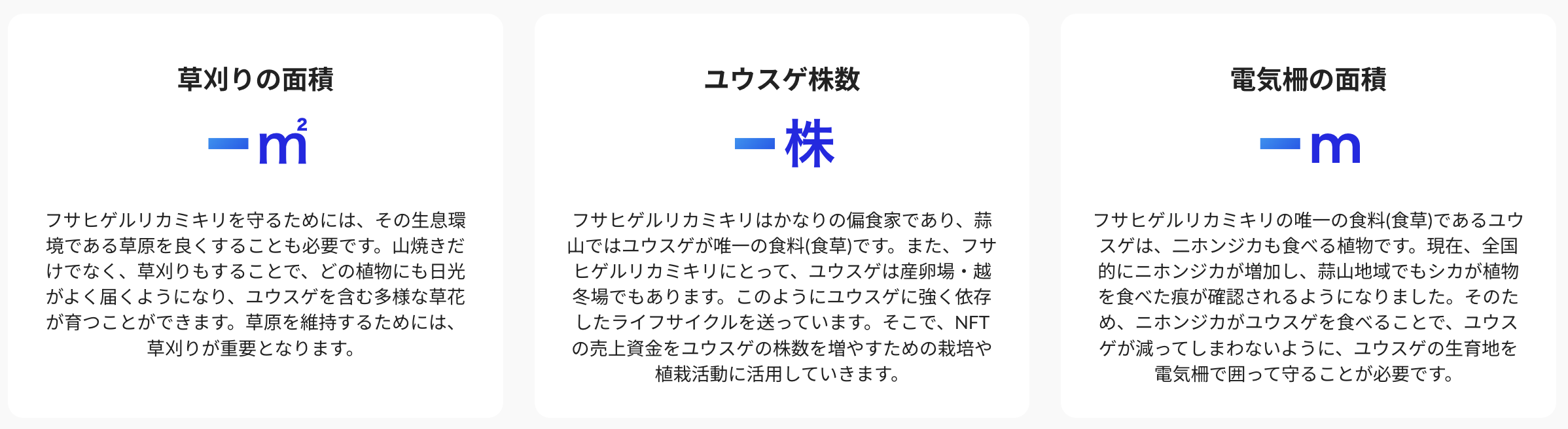 NFTの販売状況と、「ユウスゲ栽培・植栽数」「草刈り面積」「電気柵設置m」の環境保全活動の進捗は、公式サイトで確認することができます。